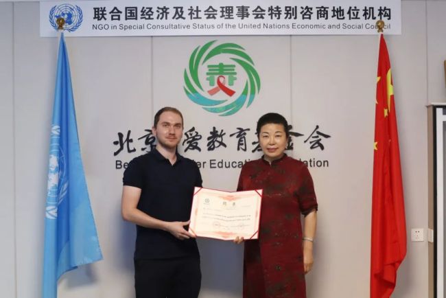 交流会期间,张银俊代表北京青爱教育基金会向土耳其青年代表雅武兹·图尔古特·乌鲁索(Yavuz Turgut Ulusoy)颁发了“青爱工程国际爱心大使”证书。