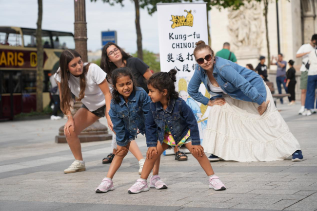 2024年7月在巴黎凯旋门前,志愿者们手持中国古代体育文化收藏卡中“八段锦”卡牌,邀请外国友人打卡八段锦。受访者供图